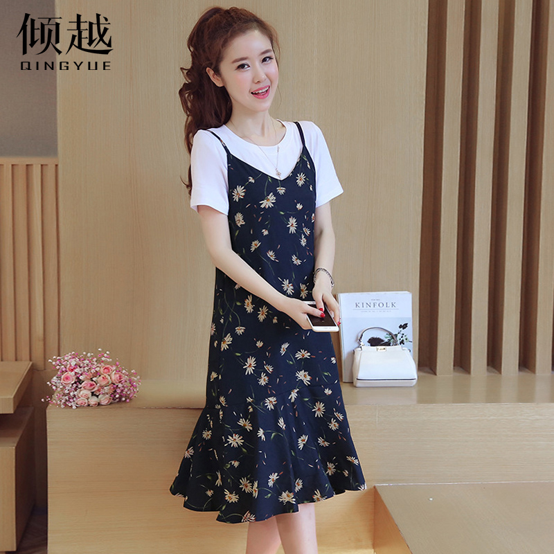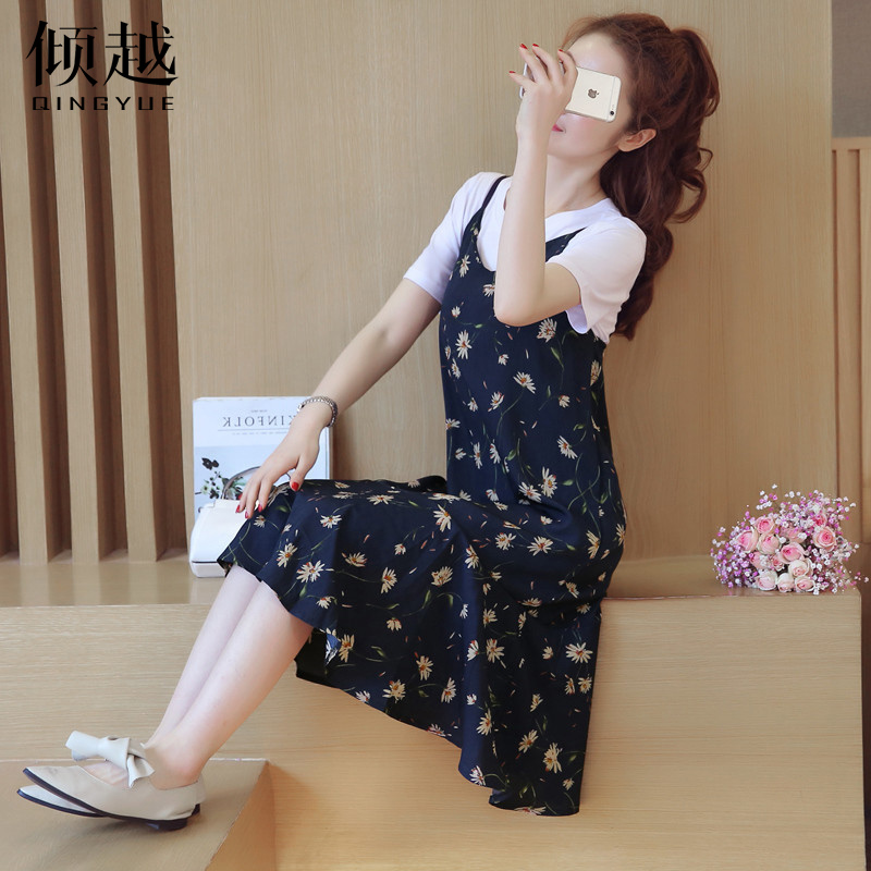 2017夏季吊帶連衣裙女套裝短袖碎花修身顯瘦雪紡中長款兩件套裙子