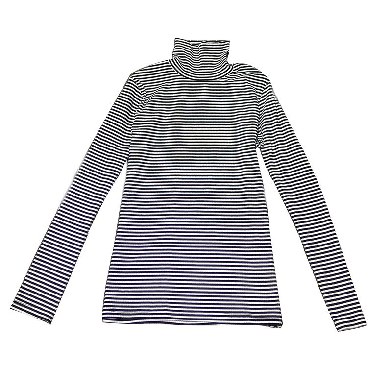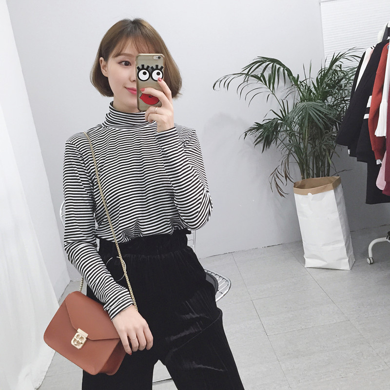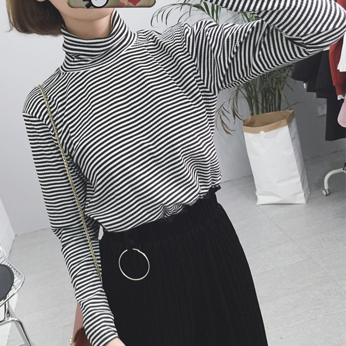 韓國chic秋冬套頭高領黑白條紋顯瘦長袖百搭打底衫上衣T恤女