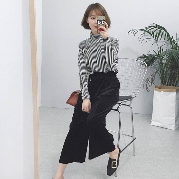 / 韓國chic秋冬套頭高領黑白條紋顯瘦長袖百搭打底衫上衣T恤女