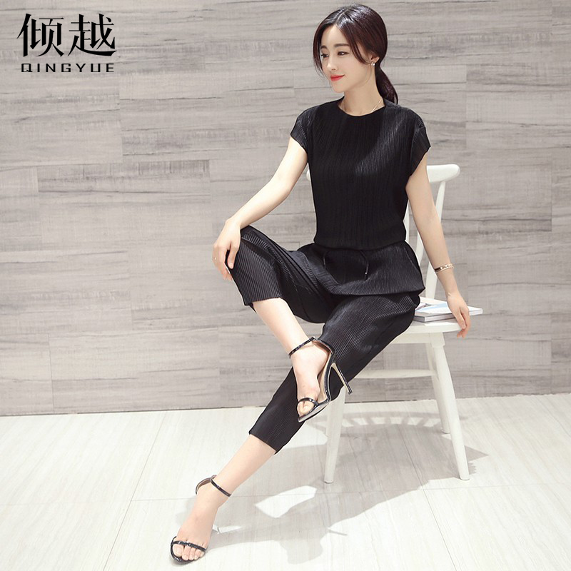 傾越2017夏季短袖雪紡衫九分褲休閑套裝寬松顯瘦兩件套夏大碼女裝