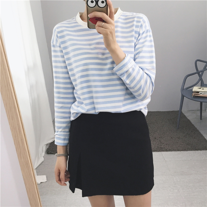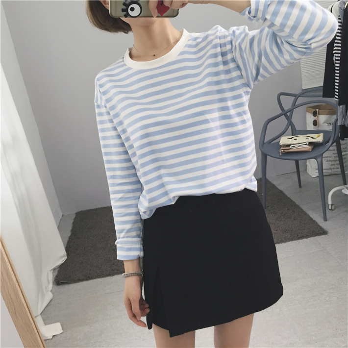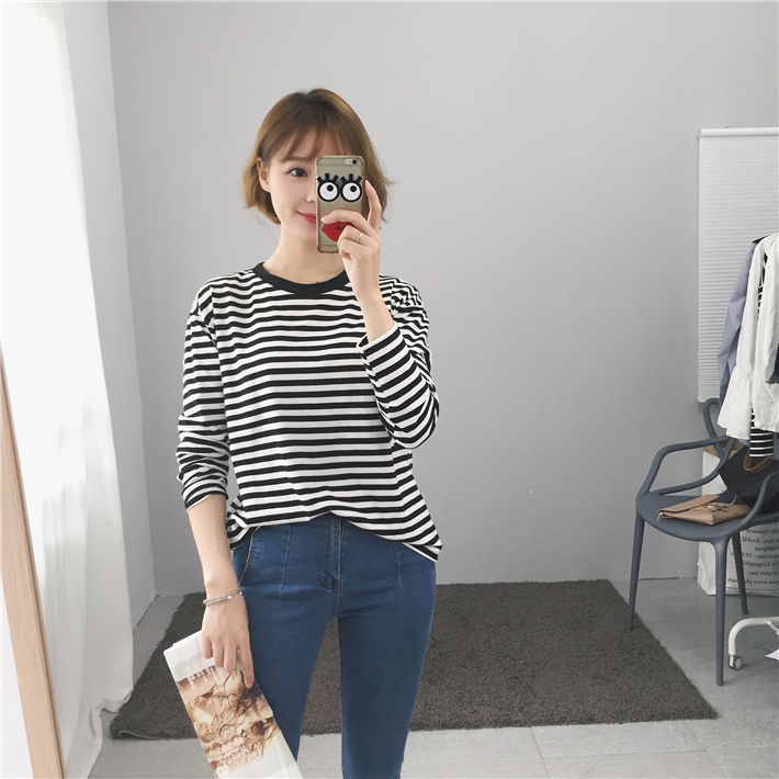/ 秋款韓國學院風寬松顯瘦百搭條紋圓領套頭打底衫上衣T恤女