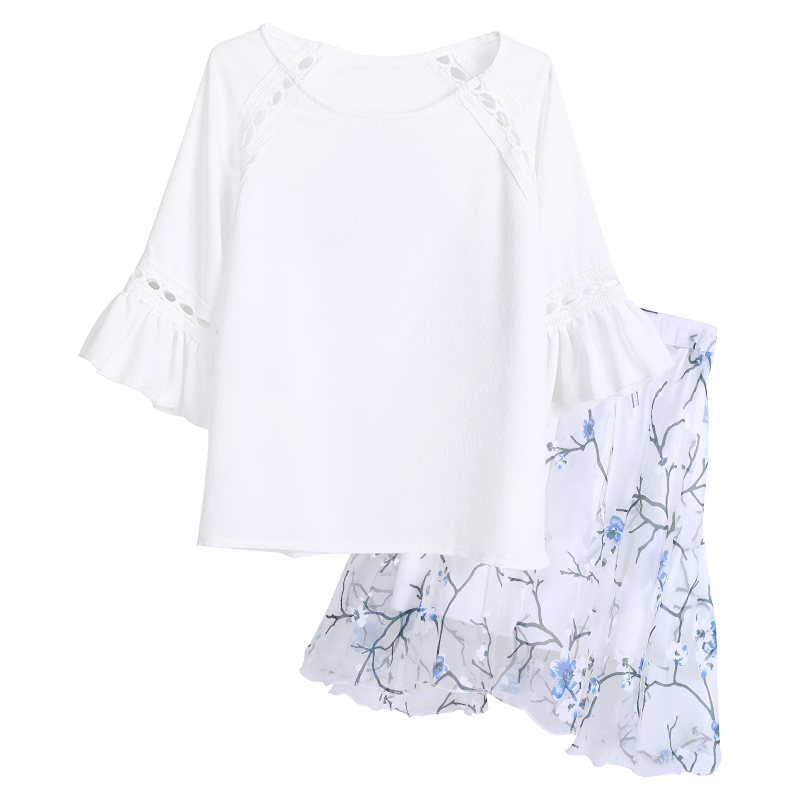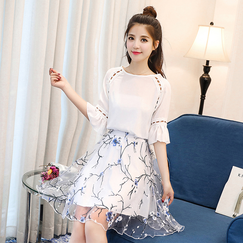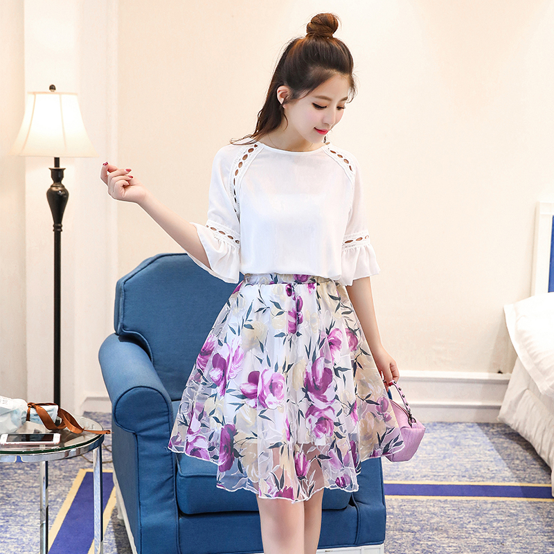 / 套裝連衣裙夏季歐洲站兩件套短袖歐根紗雪紡印花半身短裙