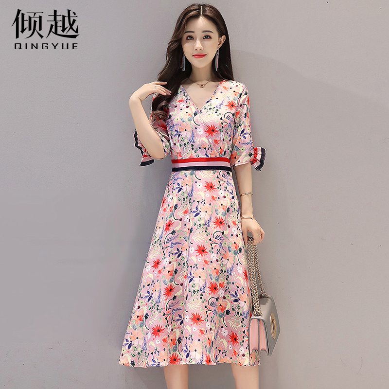碎花v領連衣裙短袖女夏季新款2017顯瘦氣質印花中長款收腰仙女裙