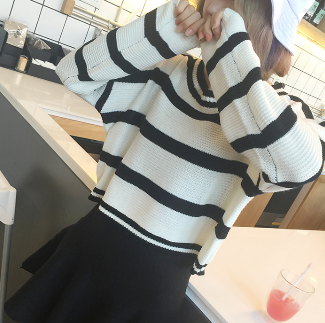 / 秋裝韓版潮新款寬松顯瘦條紋針織衫圓領套頭長袖短款上衣女裝